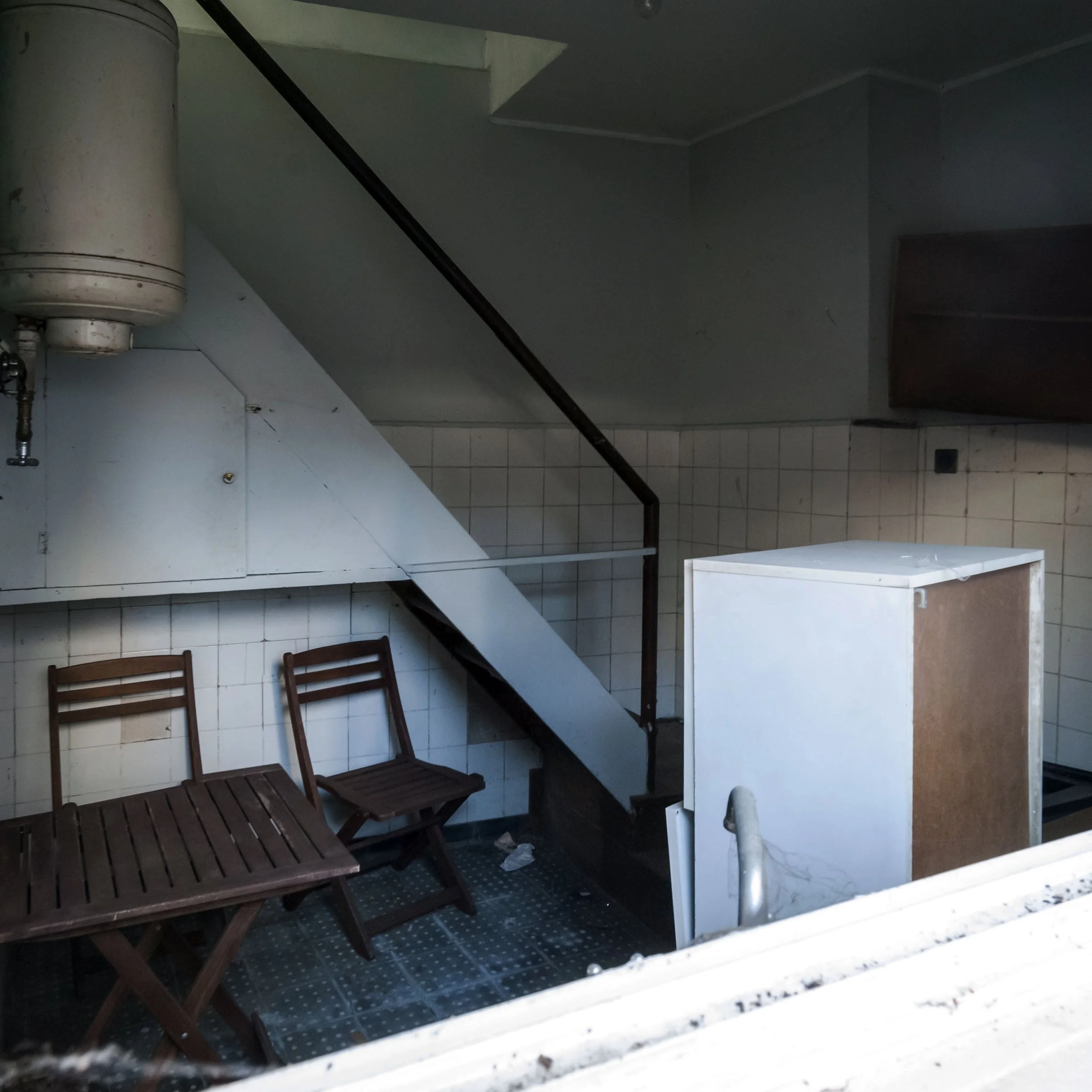 On the ground floor, our intervention consisted of reshaping the connections between the hall, bathroom and living area. The kitchen, side balcony and stairs connecting to the upper level were placed along the outer walls, freeing up the central space for a small dining table. The tiled flooring was kept despite its ‘worn’ look.