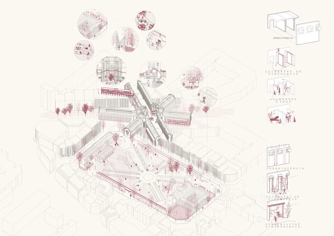 The public space, really needed in this neighbourhood as the urban analysis demonstrated, is structured to accompany the transition from metropolis to neighbourhood that occurs in the two blocks of the prison precincts…
