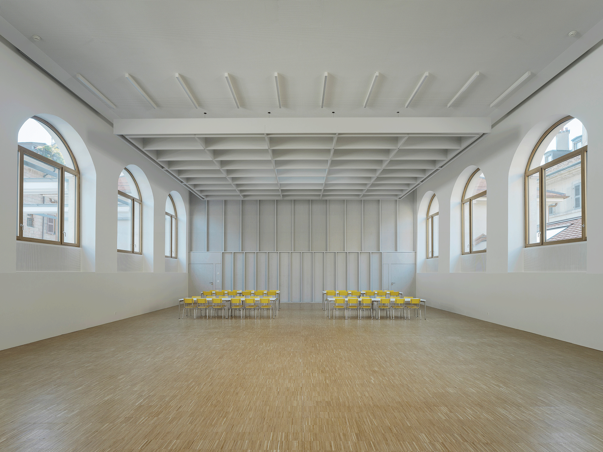 In order for the Salle to be occupied by multiple users simultaneously or used as one large room for special occasions, a suspended structure can be lowered or lifted to form a partially acoustically and thermally separated space within the Salle. This element is hung from the existing timber structure and lit via a central skylight that also provides natural ventilation to the salle.