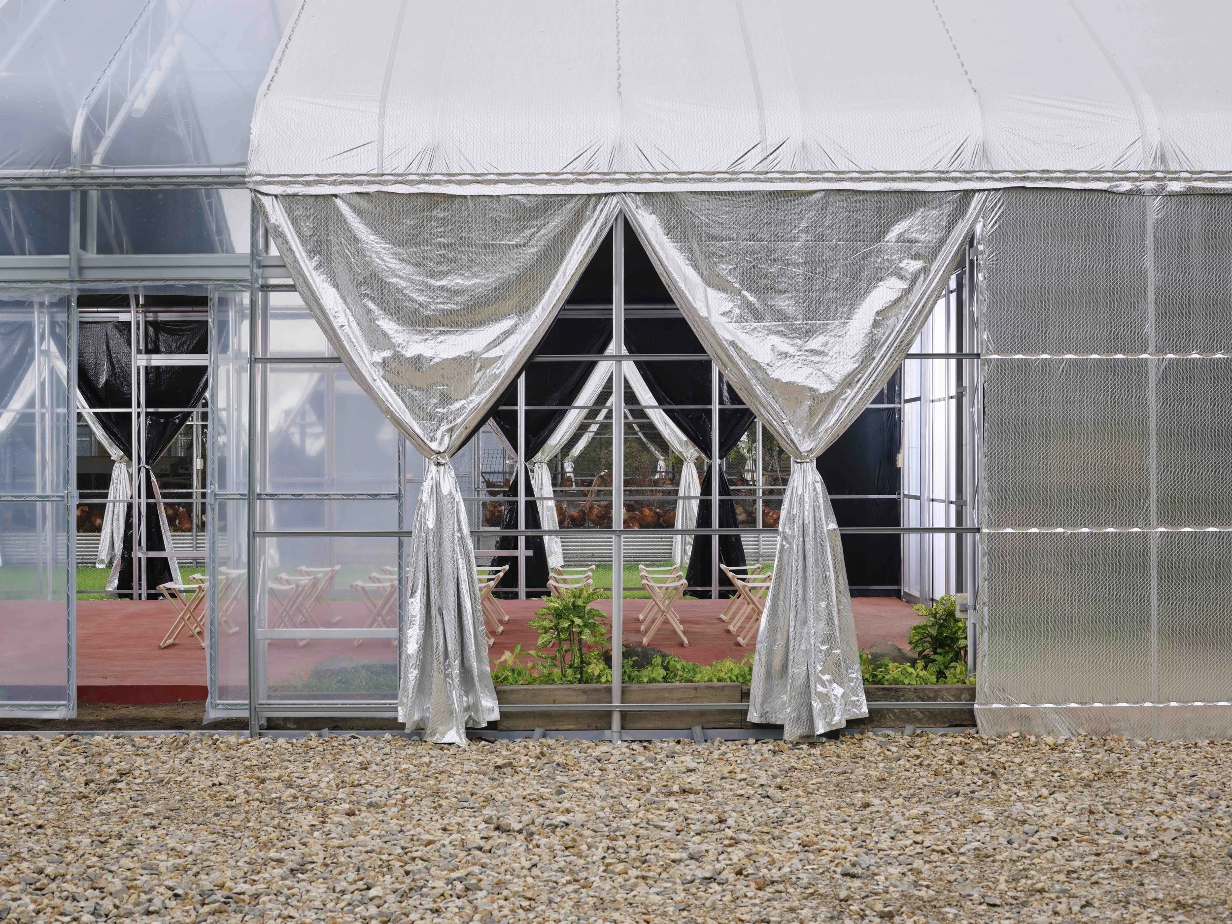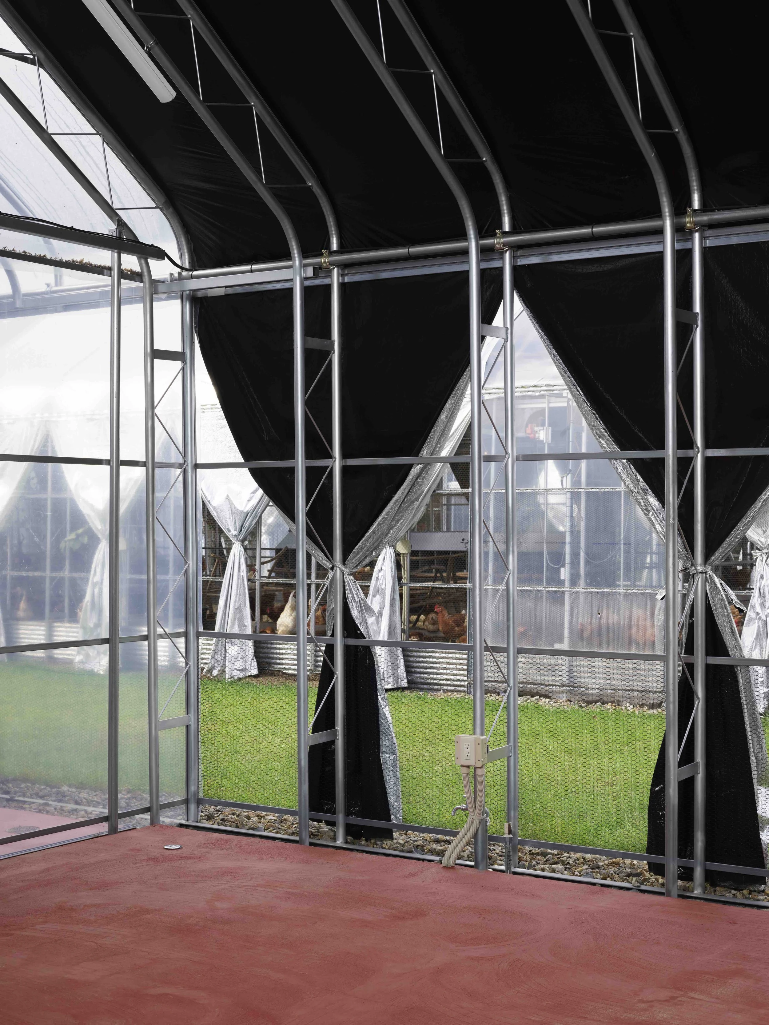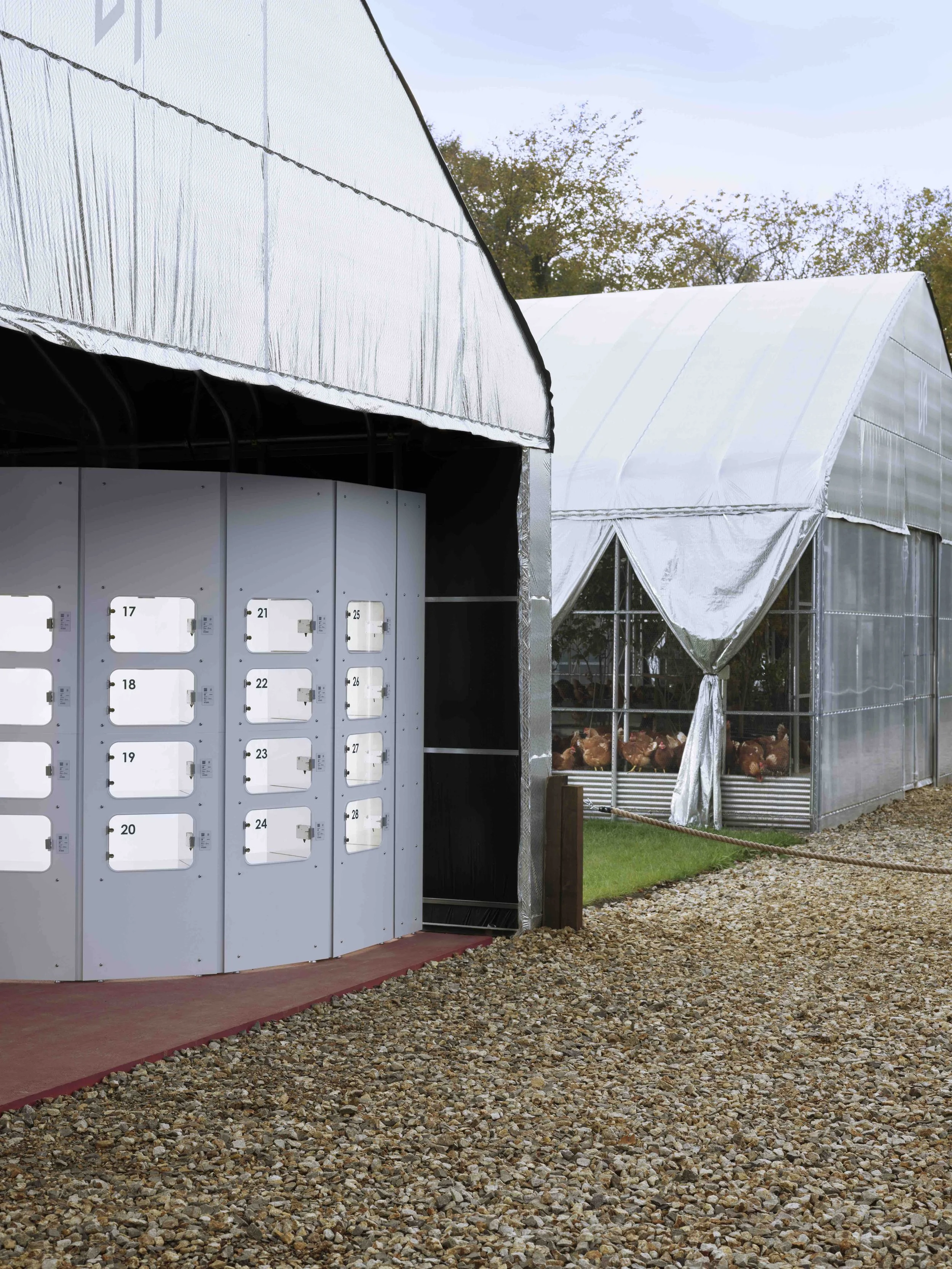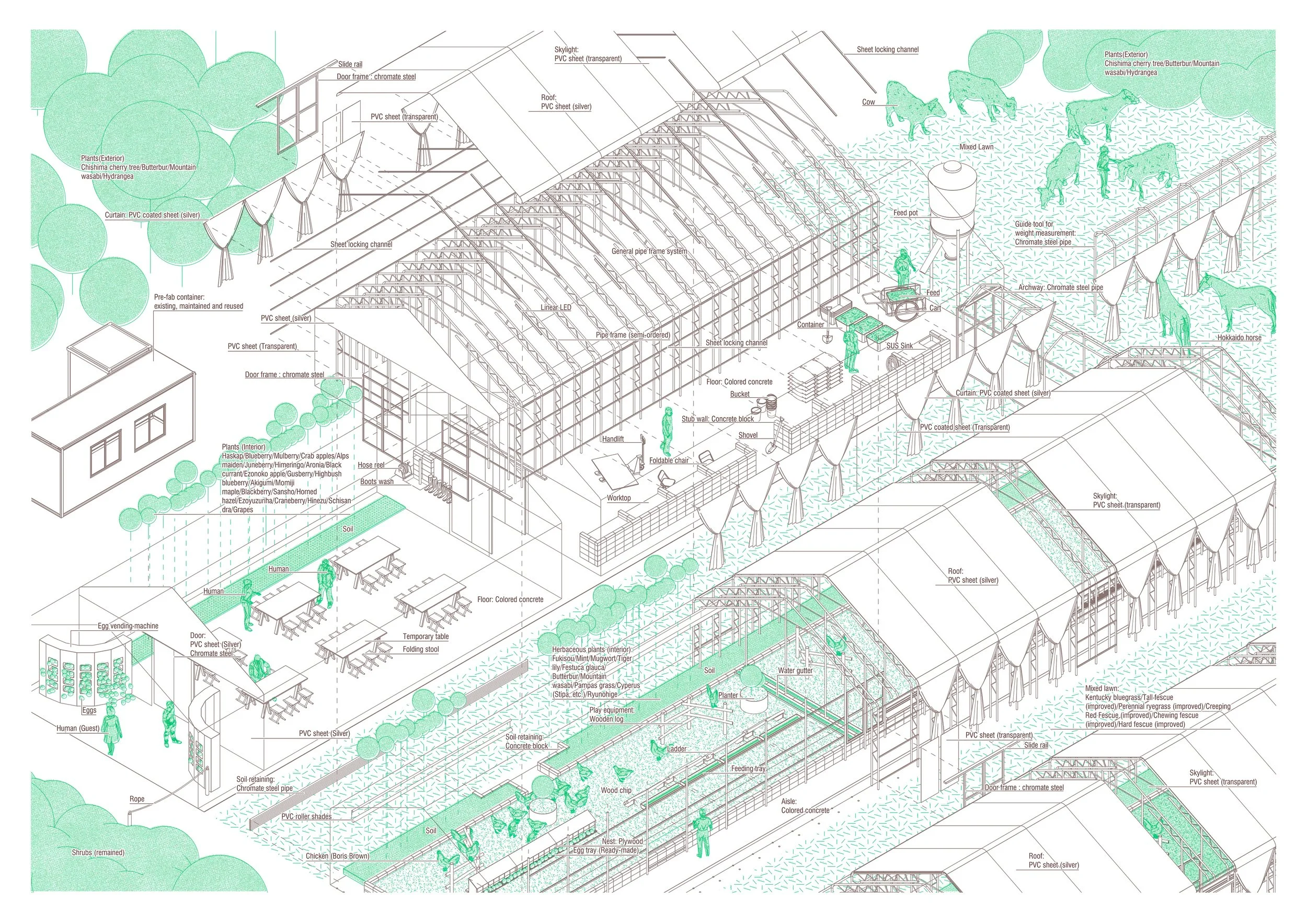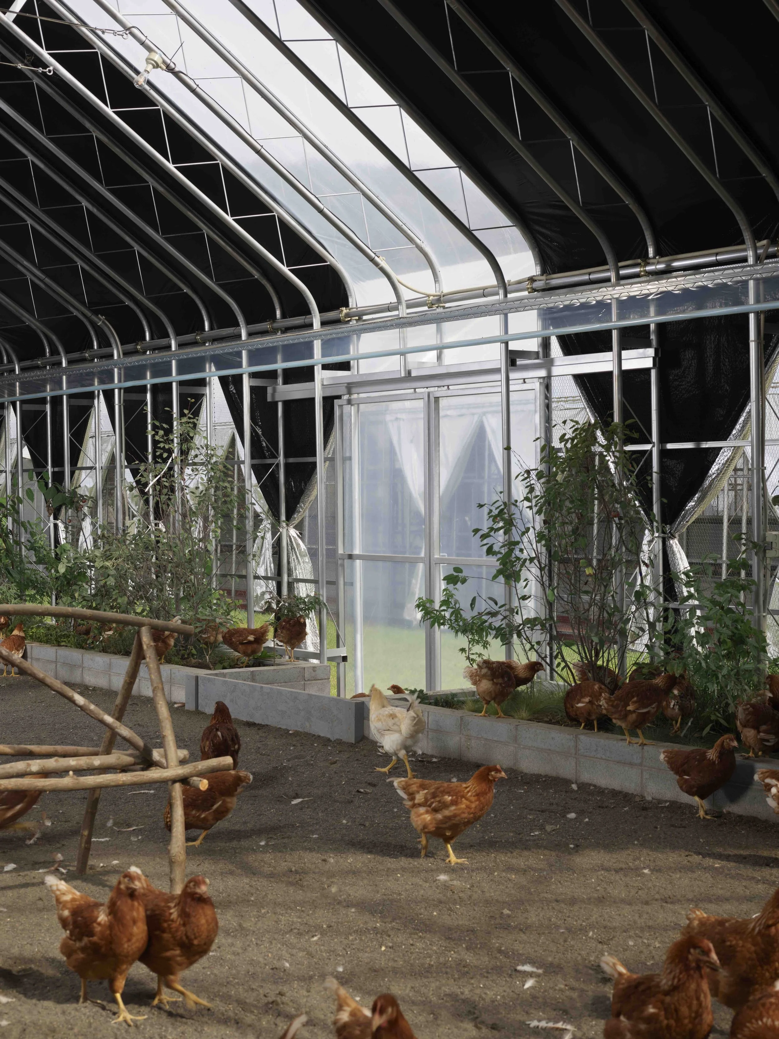Silver heat-reflective sheets were chosen as the primary exterior material to reduce heat load. In summer, these sheets can be bundled like opera curtains to improve ventilation, while in winter, they can be closed for better insulation. Periodically, transparent vinyl panels replace sections of the sheets to allow sunlight in. One corner of the farm features an unmanned egg vending station, equipped with a custom-designed vending machine whose mechanism is kept as simple as possible, making it easy to repair if needed.