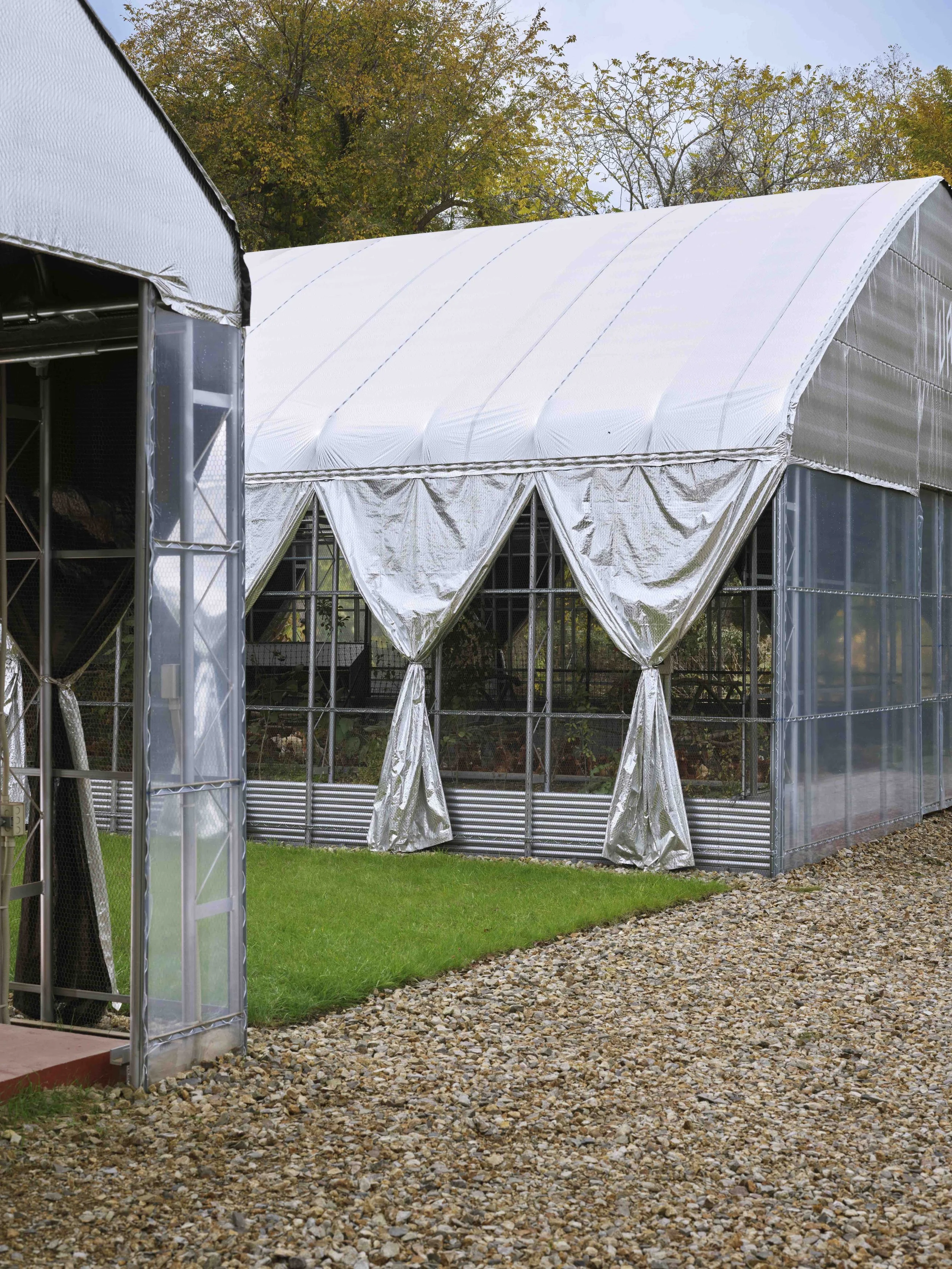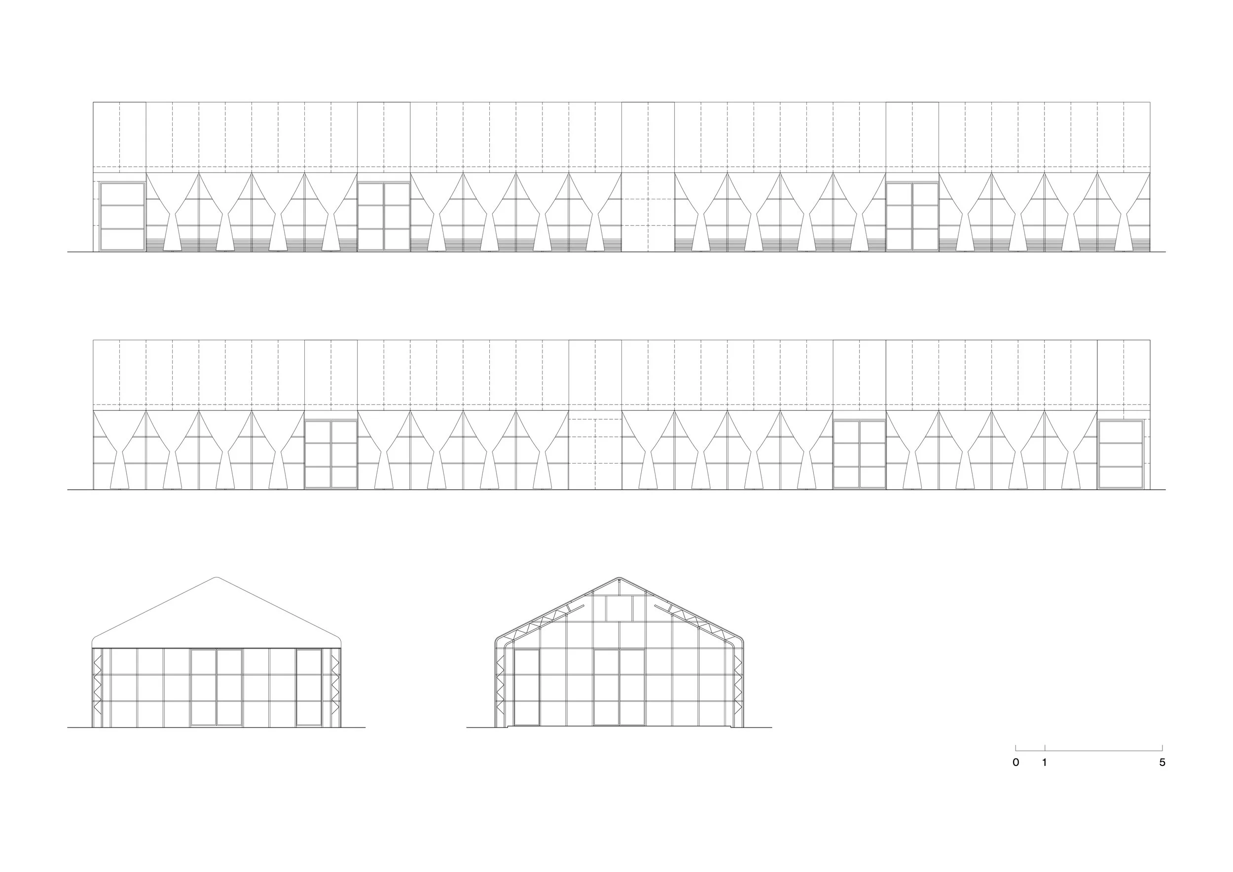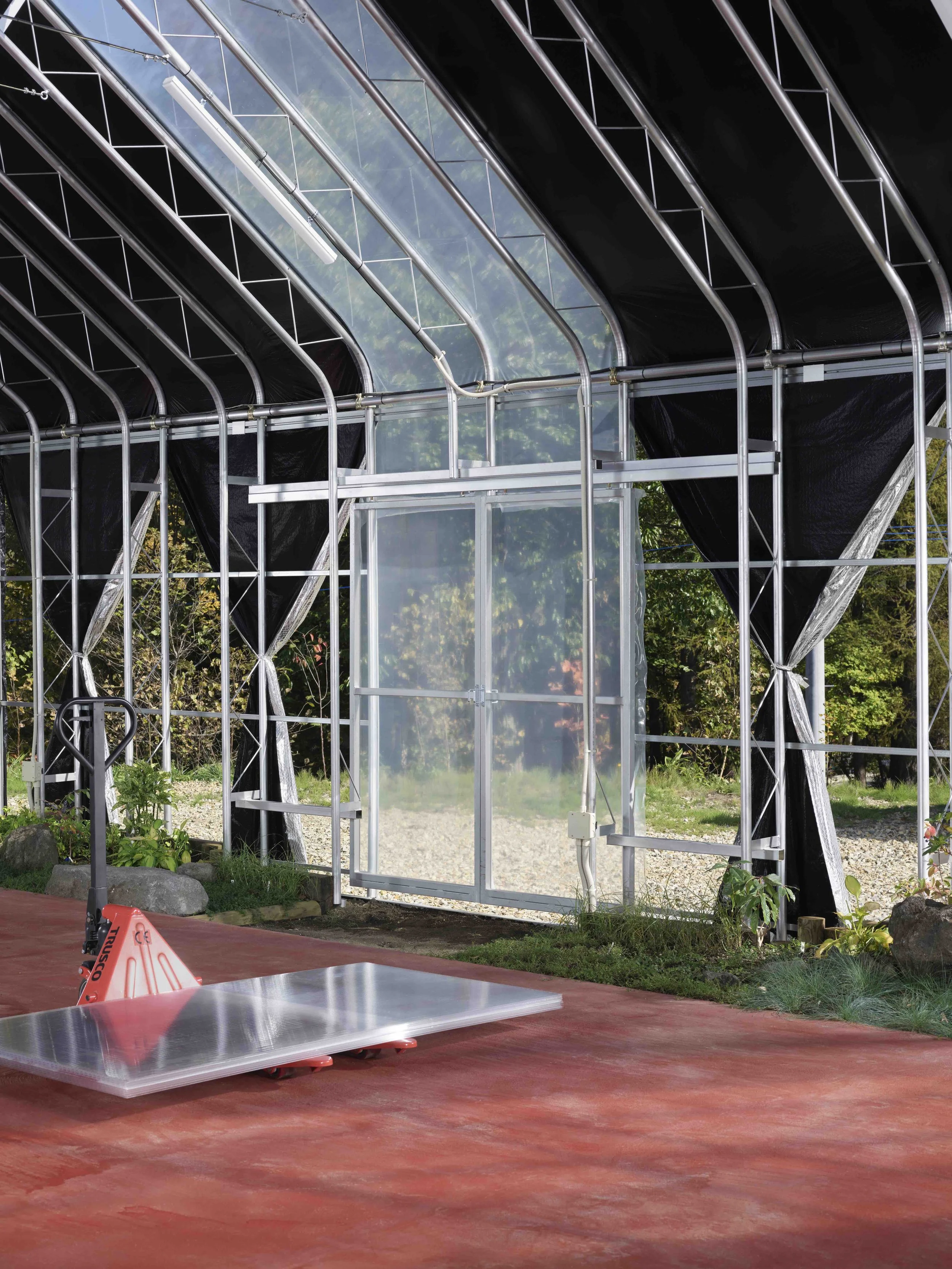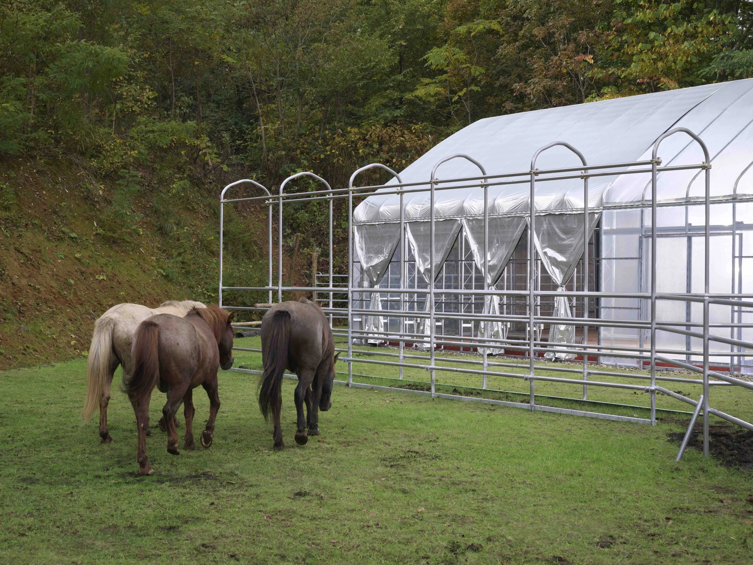 We developed a custom frame based on an existing product—an agricultural pipe house from a local Hokkaido manufacturer—which serves as the building's skeleton. With optional parts readily available at agricultural equipment stores, expanding the pipe house's functionality is straightforward, whether it involves adding openings, installing nets, or attaching fittings.