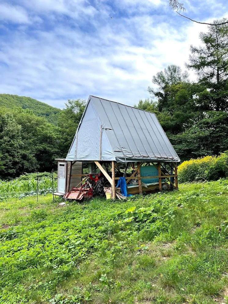 While pondering these questions during walks through the Bankei mountains, we stumbled upon a charming tool shed built by a local farmer. Constructed with plastic roofing sheets and log poles, the shed was perfectly sized to house a tractor and farming tools, with garlic and onions hanging from the beams. It felt like a custom-made tool crafted by a seasoned artisan—and it really felt “just right.” This fortunate encounter gave us insight into what the farm should be.