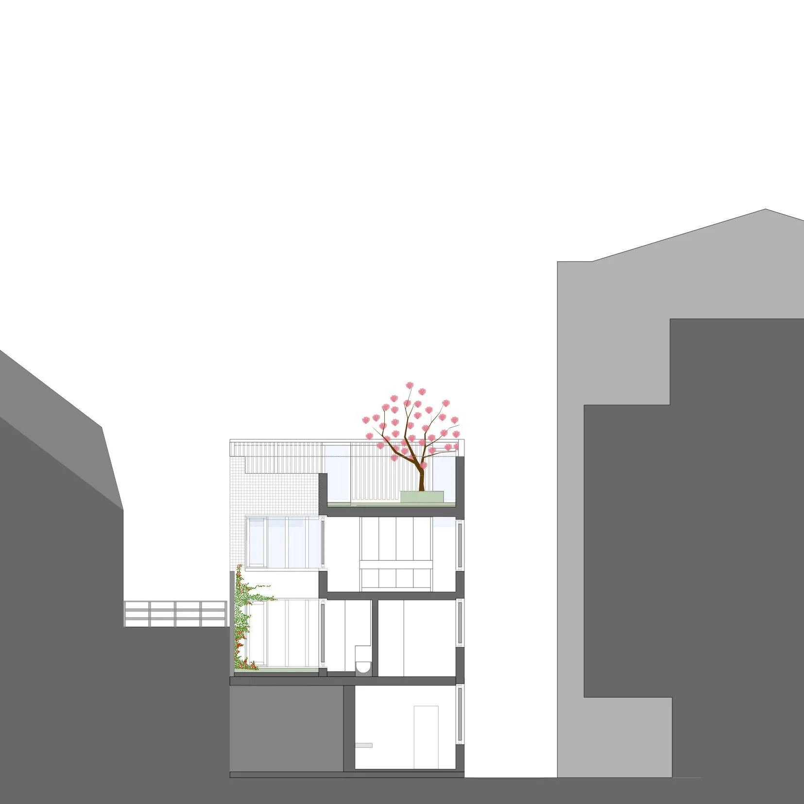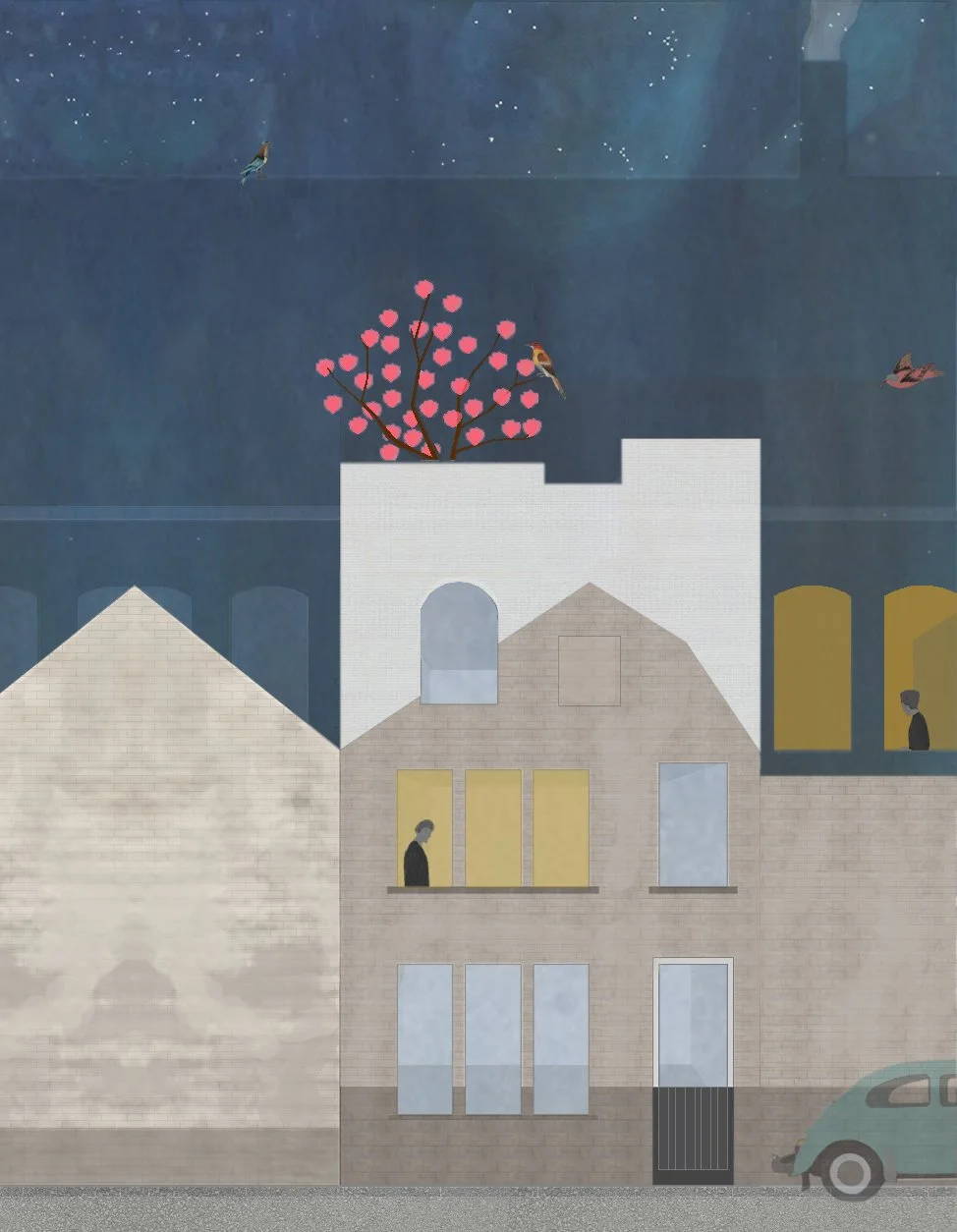 The building, with no outdoor space in its’ found condition, is being extended into a new family home with new rooftop terraces. The facade profile and the modest materiality of the existing house have been preserved and they enter into a dialogue with the adjacent house and the alley. The additional element, surmounting the original building, is finished with glossy white tiles, reflecting sunlight deeper into the alley below.
