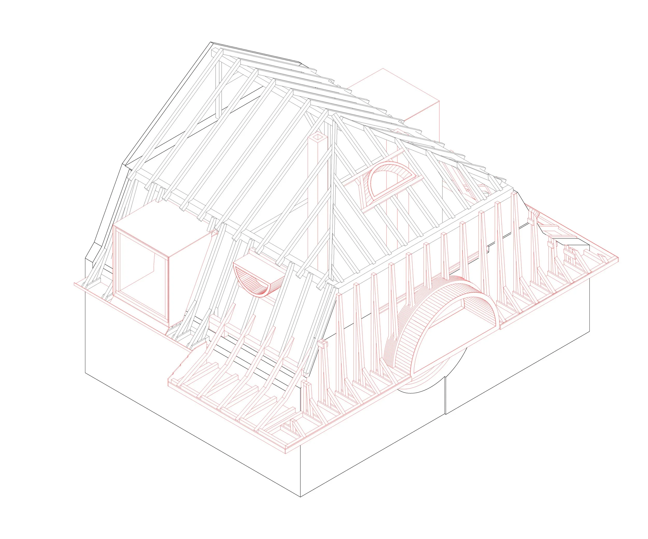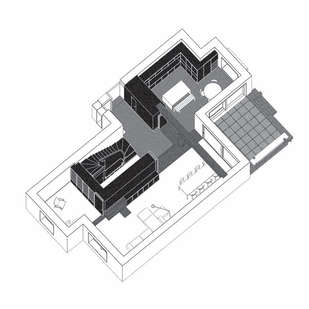 Inside, the structure was carefully stripped back on all levels, with interior partitions and the original staircase removed to allow for a complete reorganization of the layout. Only the perimeter walls, two-thirds of the existing roof, the original floor slabs, and a single load-bearing wall, once separating the stairwell from the living area, were retained.