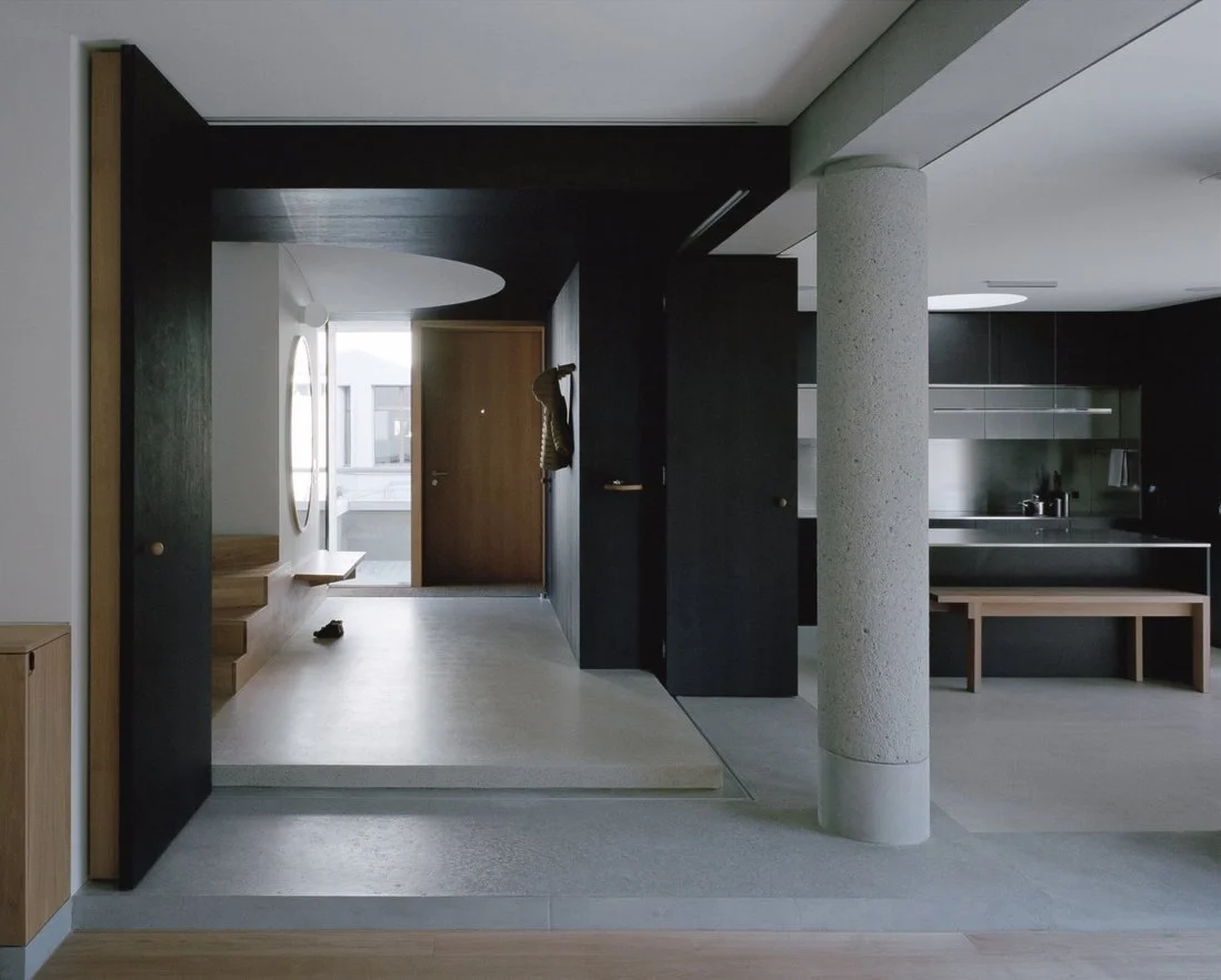 At the ground floor, a sense of spatial continuity was introduced by freeing the plan with the addition of a central concrete column to carry structural loads. This space was then organized through a deliberate contrast between a mineral landscape — formed of in-situ concrete — and a vegetal one, articulated in stained wood partitions.