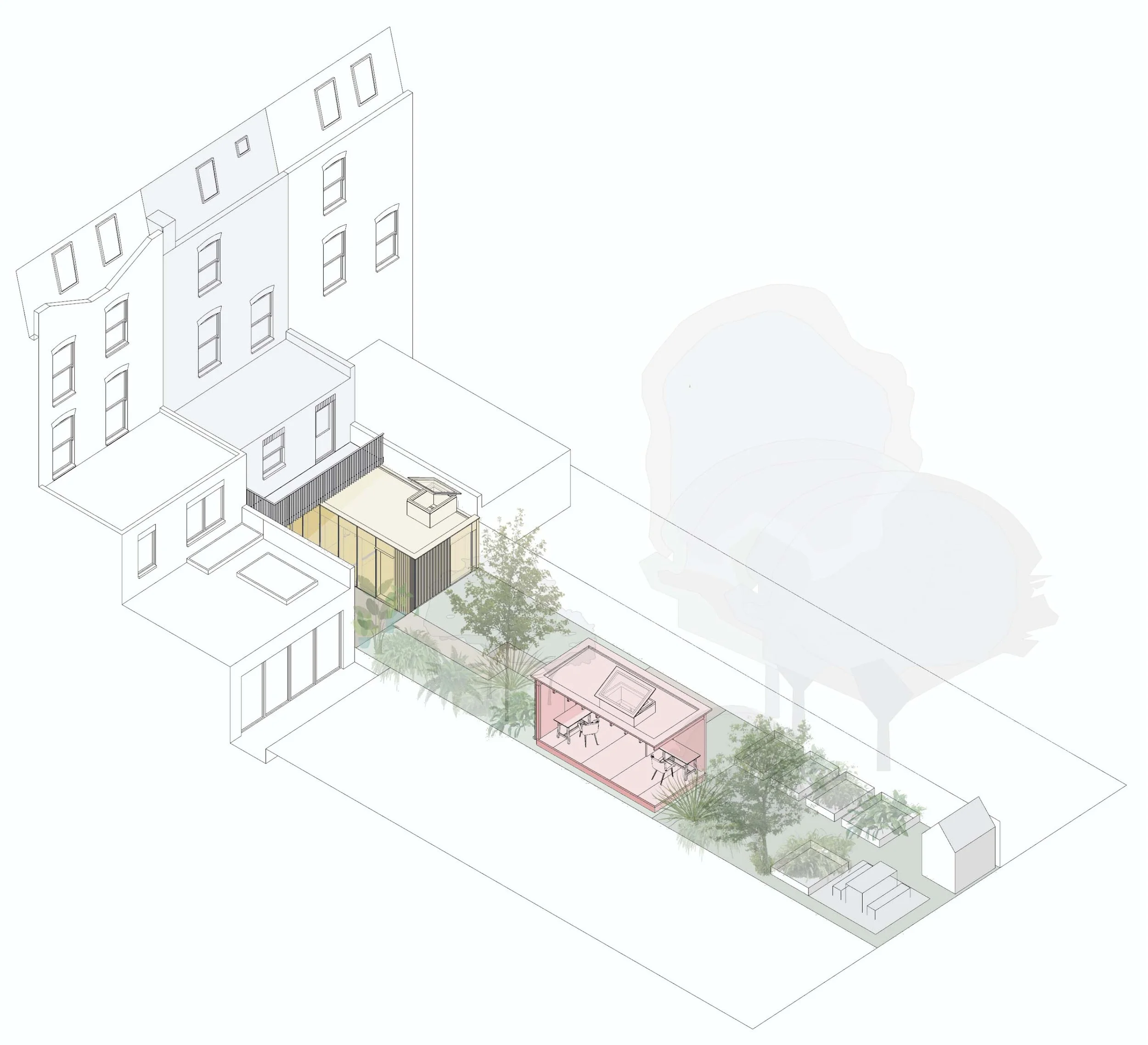 The garden is large for our inner city location and was one of the main reasons we were drawn to the flat initially. By dividing the space typically used for a full width extension and shifting one half of this into the garden to create the studio, we have given ourselves two new structures and also created an intimate garden space in-between; the sum of the parts is more than the whole. These new additions now sit comfortably amongst the palimpsest of alterations and ad-hoc developments of the neighbouring buildings. The end result is a flexible home we hope to enjoy for years to come.