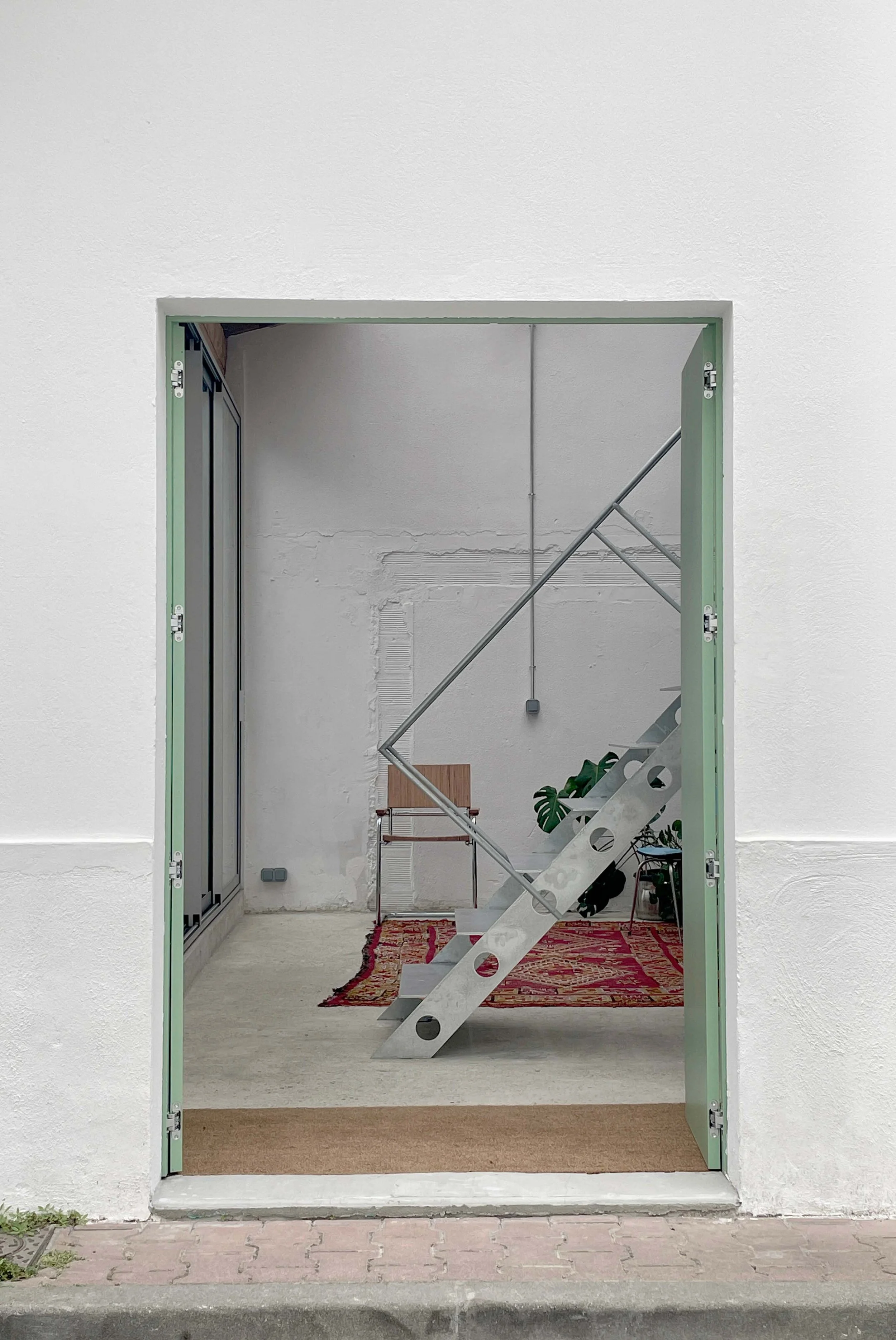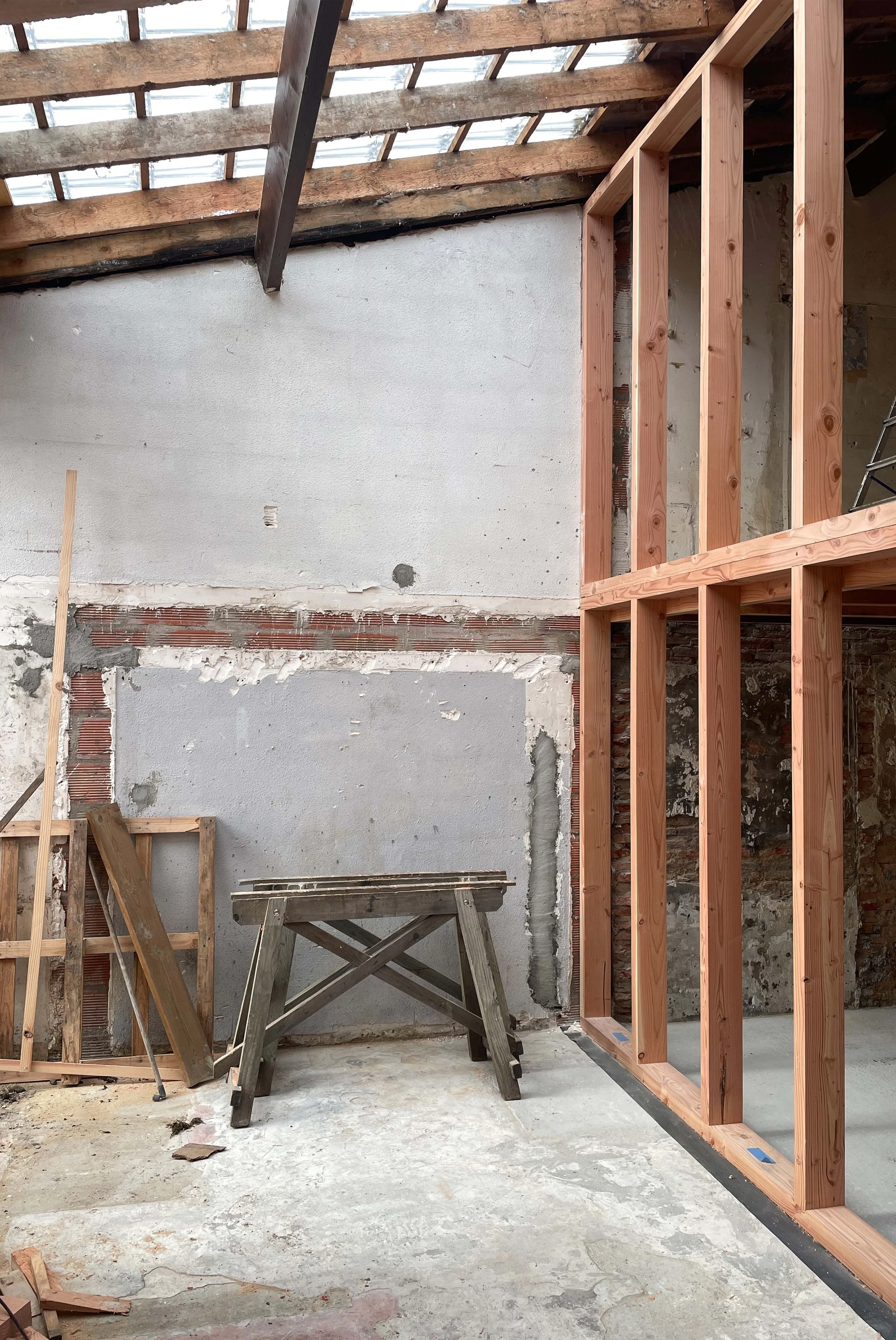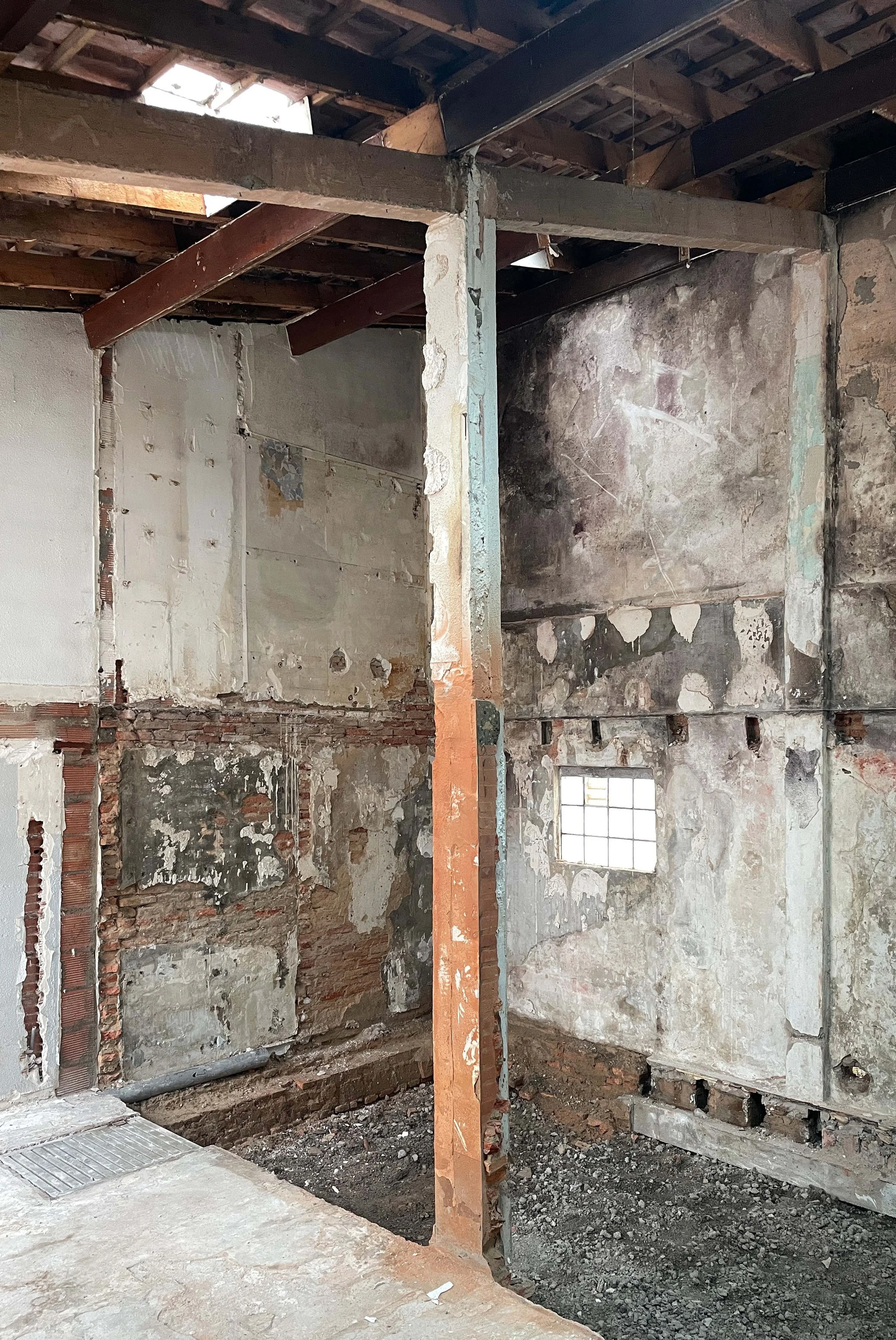 On the ground floor, the earth becomes structured beneath our feet: insulated concrete slabs ensure stability, a promise of longevity. The existing concrete is polished and lightened. The street-facing façades are sealed off, reinforcing the thin brick walls, ensuring their footing.