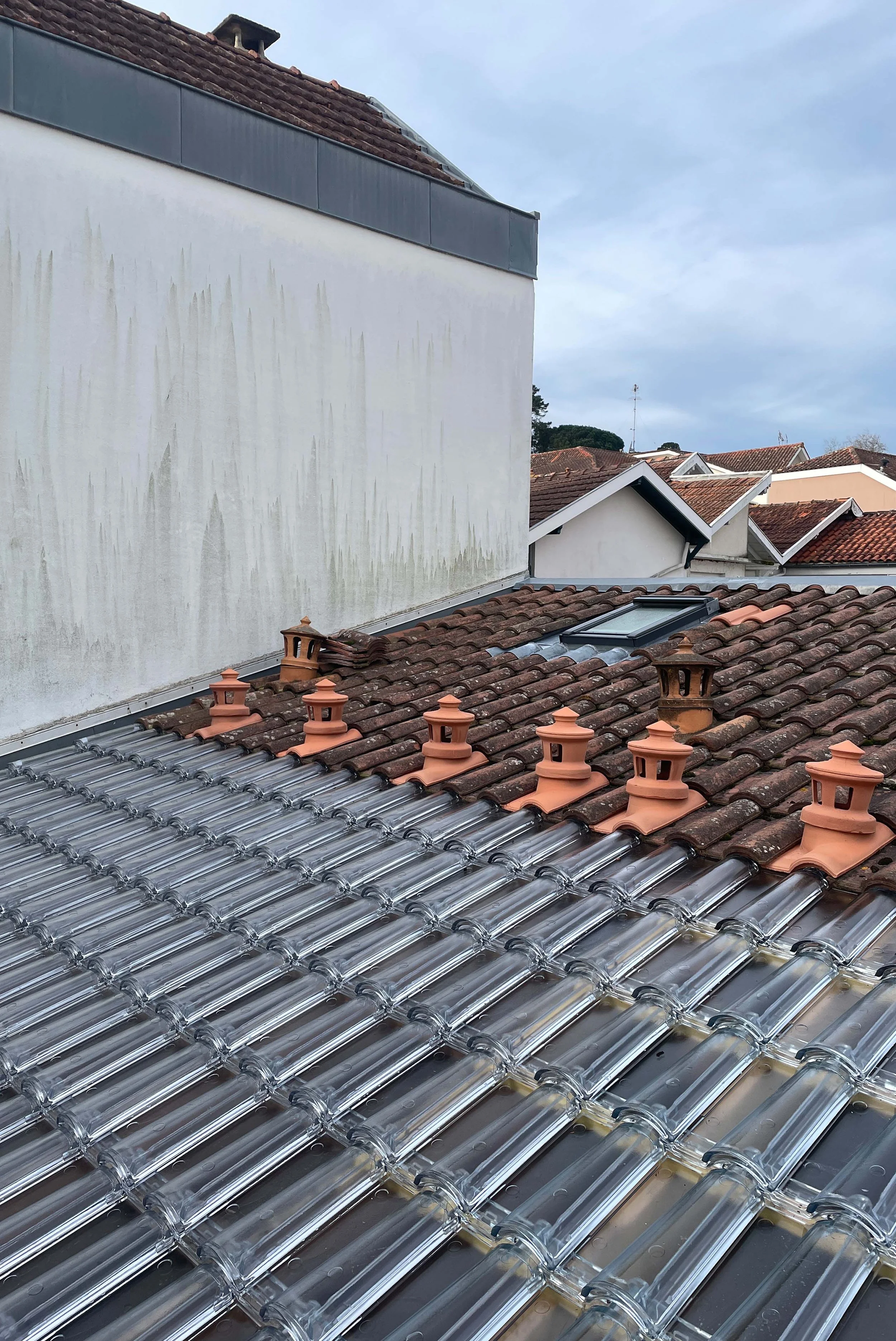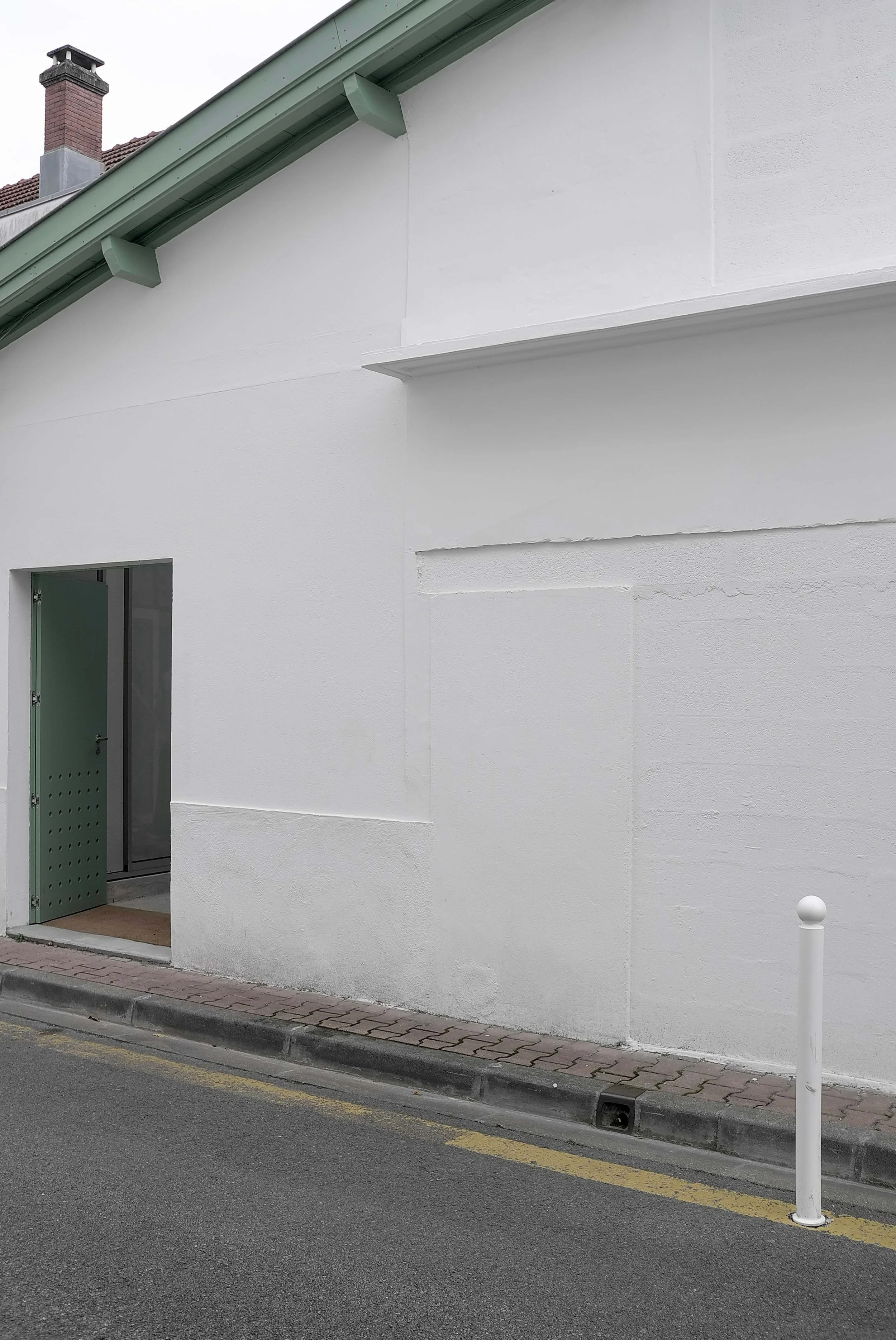 An overhang gathers rainwater — a gesture that is both technical and restrained. Air flows through: an air intake system is integrated into the front door; discreetly, tile vents allow the house to breathe.