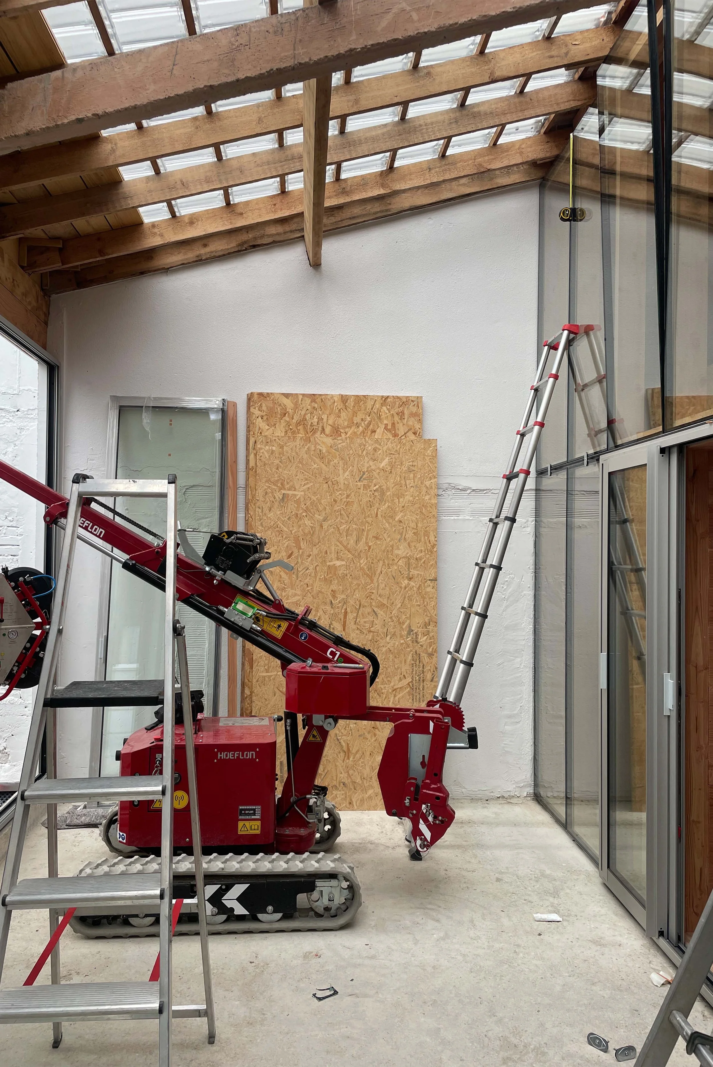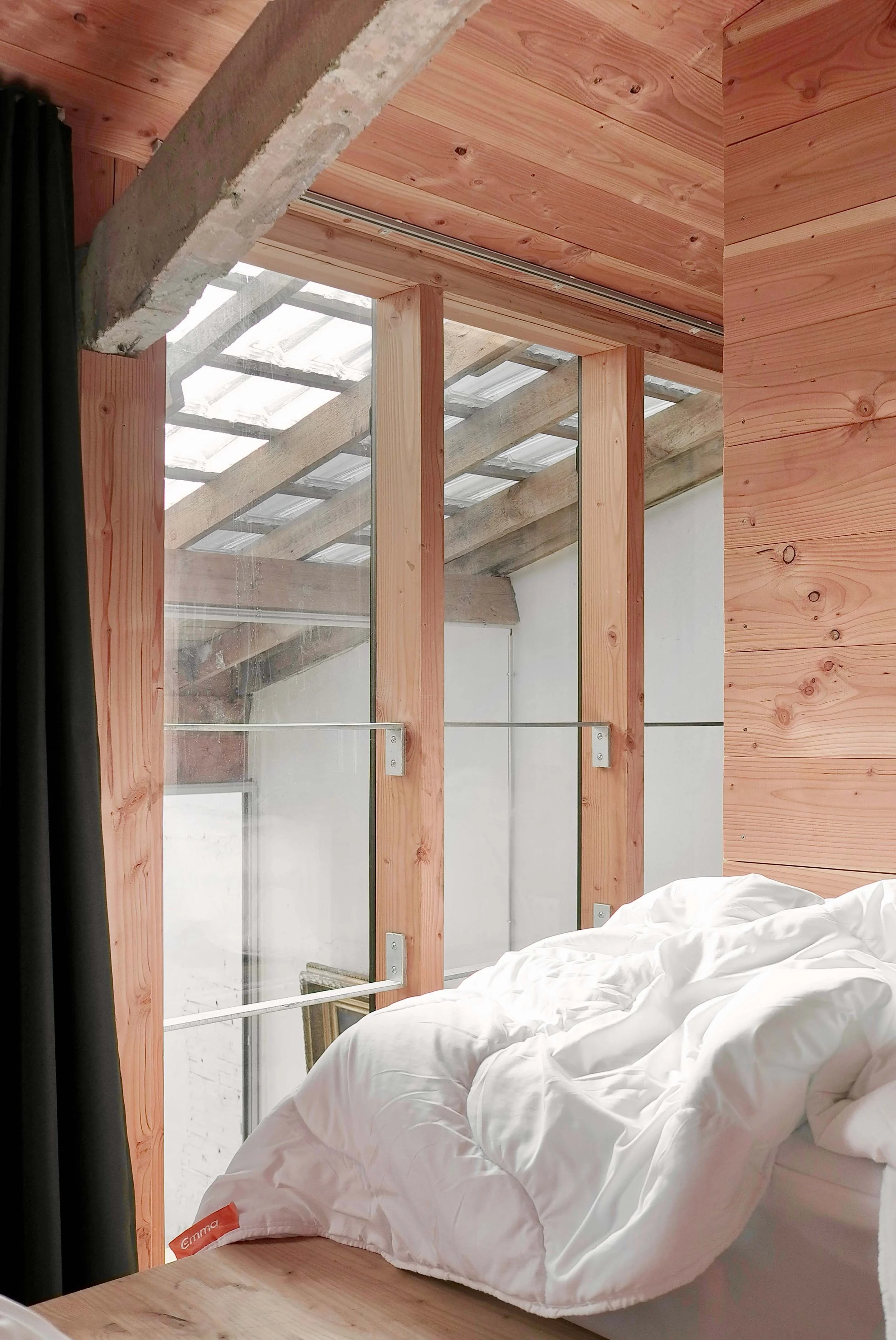 Around the voids, timber frames emerge: structural braces for the walls and roofs, insulated envelopes. One is installed on the ground floor for daytime living, the other upstairs for nighttime use — two rhythms, two ways of inhabiting the space. All are clad in Douglas fir boarding, except around the voids, which are left bare, open.