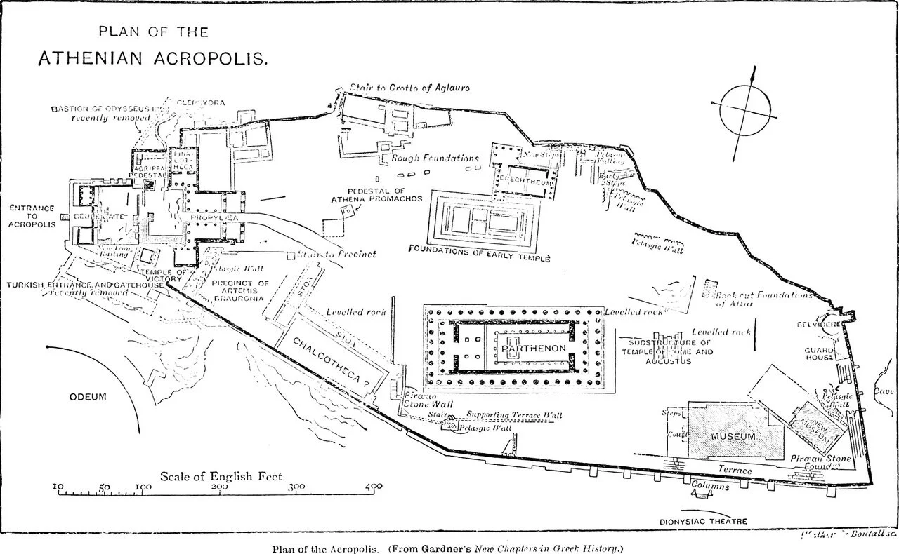 The challenge for the architect, who is considered to be Mnesicles, to whom the Propylaea is also attributed, was manifold: The building was intended to be placed on a slope at the edge of the hill, next to the remains of a Doric temple; older than the temple was a Mycenaean palace which retained the tomb of the first king of Athens, Cekrops; the old temple of Pandrosus also stood in the way, and nearby rose Athena’s sacred olive-tree, its branches overspreading the altar of Zeus Herceius, all of which were enclosed by a high wall that ran along the west and north sides.